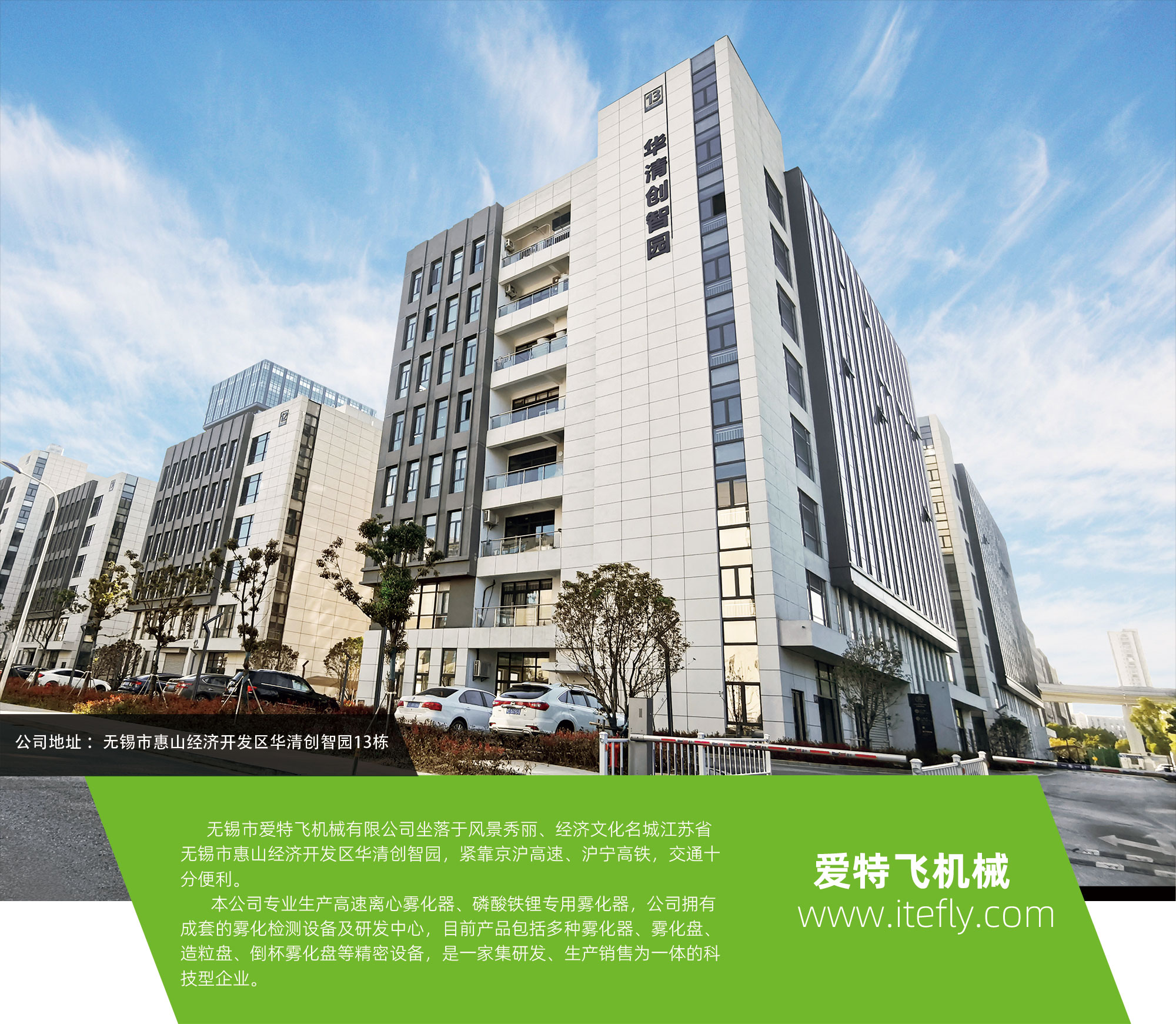无锡市爱特飞机械有限公司坐落于风景秀丽、经济文化名城江苏省无锡市惠山经济开发区华清创智园,紧靠京沪高速、沪宁高铁,交通十分便利。本公司专业生产高速离心雾化器、磷酸铁锂专用雾化器,公司拥有成套的雾化检测设备及研发中心,目前产品包括多种雾化器、雾化盘、造粒盘、倒杯雾化盘等精密设备,是一家集研发、生产销售为一体的科技型企业。